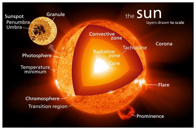 2) ชั้นบรรเทาภาคของดวงอาทิตย์ แบ่งเป็น 3 ชั้น คือ2.1 ชั้นไพ่นสเสีทร์ (กะctosphere) หรือ ทรงกลมแสง เป็นบรรยากาศชั้นในสุดของดวงอาทิตย์ มีอุณหภูมิประมาณว่า เคลวิน หนาประมาณ 400 กิโลเมตร ประกอบด้วยแก๊สร้อนซึ่งเคลื่อนที่ อยู่ตลอดเวลาจิเวณที่สามารถมองเห็นได้ด้วยตาเปล่า ซึ่งการสังเกตดวงอาทิตย์โดยตรงต้องสังเกต โดยใช้แผ่นกรองแสงสุริยะทุกครั้ง 2.2 ในโครโมสเฟียร์ (chromosphere) หรือ ทรงกลมลี เป็นชั้นบรรยากาศที่ห่อหุ้ม โฟโตสเฟียร์ไว้ หนาประมาณ 1,700 กิโลเมตร มีอุณหภูมิประมาณ 10,000 - 100,000 เคลวิน และมีความหนาแน่นน้อยกว่าโฟโตสเฟียร์ 2.3 คอโรนา (corona) เป็นบรรยากาศ ชั้นนอกสุดซึ่งมีความหนาแน่นน้อยกว่าชั้น โครโมสเฟียร์ สามารถแผ่กระจายออกไปไกลมาก มีอุณหภูมิสูงมากประมาณ 1 - 2 ล้านเคลวิน คนบนโลกจะเห็นบางส่วนของบรรยากาศชั้นนี้ ได้เฉพาะขณะเกิดสุริยุปราคาเต็มดวง |